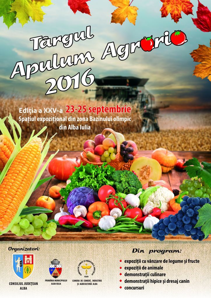 Consiliul Judeţean Alba împreună cu Primăria Municipiului Alba Iulia și Camera de Comerţ, Industrie şi Agricultură Alba, organizează, în data de 23 – 25 septembrie 2016, cea de-a XXV-a ediţie a Târgului APULUM AGRARIA, eveniment devenit reprezentativ pentru județul Alba.APULUM AGRARIA promite să fie, și în acest an, un important loc de întâlnire pentru fermieri, producători, furnizori de maşini/unelte și specialiști din domeniul agricol și publicul amator, unde vor fi organizate expoziţii cu vânzare de produse alimentare, standuri cu legume, fructe, material săditor și produse fitosanitare, expoziţii de animale mari, animale mici, pasări, unelte, utilaje şi echipamente agricole, concursuri, demonstraţii culinare și alte momente atractive.