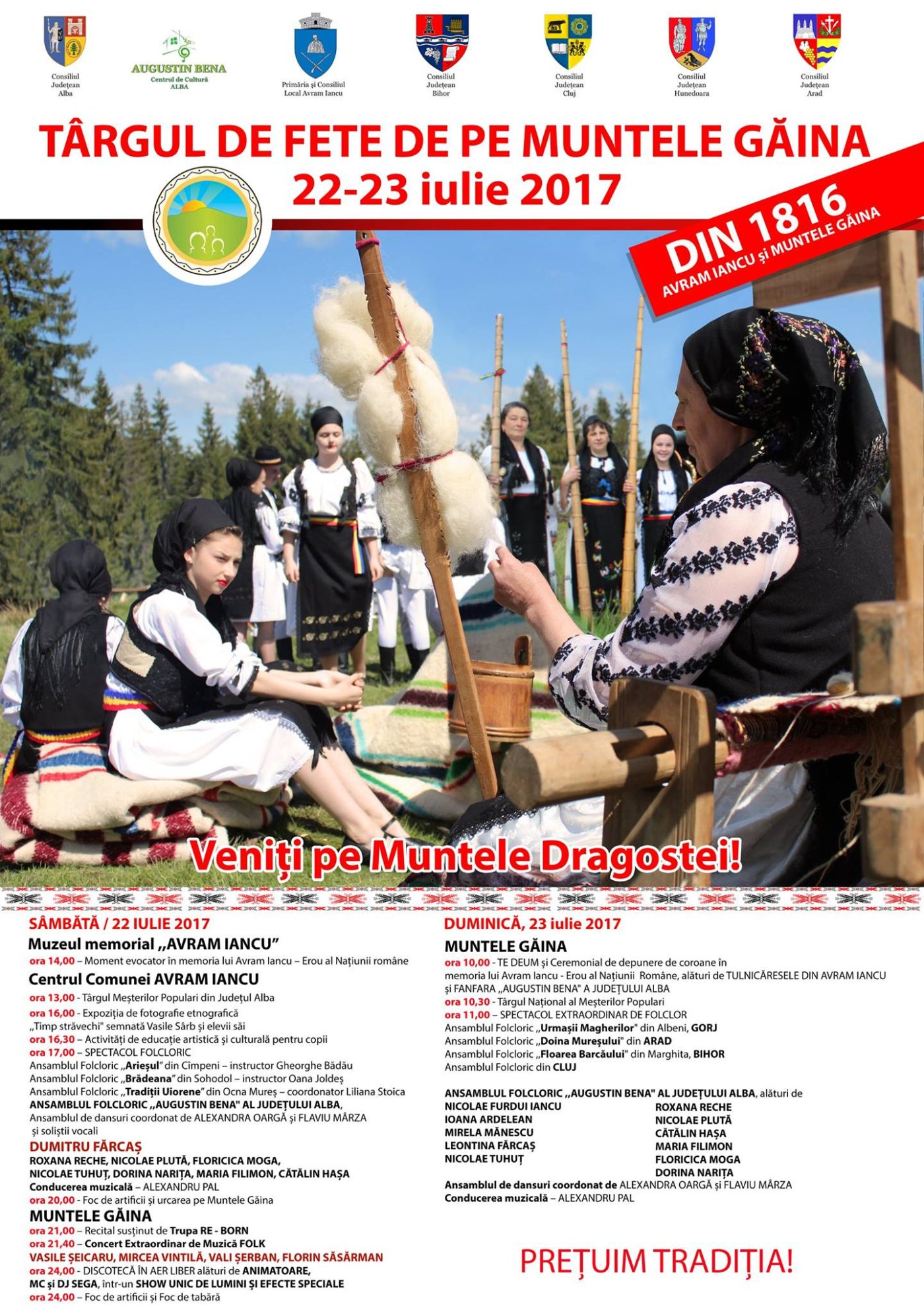 Târgul de Fete de pe Muntele Găina –cea mai mare şi mai cunoscută sărbătoare populară din RomâniaSărbătoarea este organizată de sute de ani în cea mai apropiată duminică de praznicul Sfântului Ilie* 22 – 23 iulie 2017 – la Avram Iancu şi pe Muntele Găina *Mii de oameni sunt aşteptaţi la sfârşitul acestei săptămâni la Târgul de Fete de pe Muntele Găina, cea mai mare şi mai cunoscută sărbătoare populară din România. Târgul este organizat de sute de ani în cea mai apropiată duminică de sărbătoarea Sfântului Ilie (20 iulie) şi păstrează caracteristicile tradiţionale autentice. Spectacole folclorice cu nume mari ale muzicii populare româneşti, concerte de muzică folk şi muzică uşoară, focuri de artificii şi petreceri în aer liber sunt câteva dintre ingredientele ediţiei din acest an.Târgul de Fete va debuta, sâmbătă, în Avram Iancu, cea mai apropiată localitate de Muntele Găina, deschiderea oficială fiind dată de tulnicăresele din Apuseni şi de cântecul unic al tulnicelor, instrument simbol al Târgului de Fete dar şi al Ţării Moţilor. În acest an în deschiderea festivă se va alătura şi Fanfara „Augustin Bena” a Judeţului Alba. De la ora 14,00 va avea loc la Muzeul Memorial „Avram Iancu” un moment evocator în memoria lui Avram Iancu cel care a fost declarat de Parlamentul României erou al națiunii române. În centrul comunei Avram Iancu va avea loc un târg al meșterilor populari dar şi o expoziţie de fotografie etnografică denumită „Timp Străvechi” şi fiind semnată Vasile Sârb și elevii săi de la Clasa de Arte Vizuale Moderne din cadrul Centrului de Cultură „Augustin Bena”. În program sunt incluse apoi activităţi de educaţie artistică şi culturală pentru copii realizate de reprezentanţii Şcolii de Arte şi Meşteşuguri din cadrul Centrului de Cultură „Augustin Bena” Alba. La ora 17,00 în centrul comunei Avram Iancu va avea loc un spectacol folcloric în care vor evolua : Ansamblul Folcloric „Arieșul” din Cîmpeni – instructor Gheorghe Bădău, Ansamblul Folcloric „Brădeana” din Sohodol – instructor Oana Joldeș, Ansamblul Folcloric „Tradiții Uiorene” din Ocna Mureș – coordonator Liliana Stoica, Ansamblul Folcloric „Augustin Bena” al judeţului Alba şi Ansamblul de dansuri coordonat de Alexandra Oargă și Flaviu Mârza. De asemenea pe scenă vor urca şi maestrul Dumitru Fărcaş dar şi soliştii Roxana Reche, Nicolae Plută, Floricica Moga, Nicolae Tuhuț, Dorina Narița, Maria Filimon, Cătălin Hașa. Conducerea muzicală este asigurată de Alexandru Pal. La ora 20,00 va avea loc un foc de artificii în Avram Iancu şi apoi participanţii vor urca pe Muntele Găina.Sâmbătă seara – Târgul de Fete se mută pe Muntele Găina, unde de la ora 21,00 va avea loc un recital susținut de trupa RE-BORN, iar de la ora 21,40 un concert extraordinar de muzică folk cu Vasile Șeicaru, Mircea Vintilă, Vali Șerban, Florin Săsărman. Petrecerea va continua pe Muntele Găina până târziu în noapte cu discotecă în aer liber, focuri de tabără şi focuri de artificii, atmosfera fiind întreţinută de MC și DJ SEGA, într-un show unic de lumini și efecte speciale. Duminică – Târgul de Fete debutează, la ora 10,00, cu un ceremonial solemn la Crucea Iancului de pe Muntele Găina, unde va avea loc o slujbă Te Deum şi oficialităţile prezente la eveniment vor depune coroane de flori. Momentul solemn va fi accentuat de Tulnicăresele din Avram Iancu și Fanfara „Augustin Bena” a Județului Alba. La ora 10,30 va fi deschis Târgul Meşterilor Populari la care meşteri iscusiţi îşi vor prezenta roadele muncii lor respectiv obiecte tradiţionale pe care continuă să le fabrice prin tehnici vechi de sute de ani. La ora 11,00 va începe un spectacol extraordinar de folclor în care vor evolua Ansamblul Folcloric „Urmașii Magherilor” din Albeni (Gorj), Ansamblul Folcloric „Doina Mureșului” din Arad, Ansamblul Folcloric „Floarea Barcăului” din Marghita (Bihor), Ansamblul Folcloric din Cluj, Ansamblul Folcloric „Augustin Bena” al județului Alba, alături de: Nicolae Furdui Iancu, Ioana Ardelean, Mirela Mănescu, Leontina Fărcaș, Nicolae Tuhuț, Roxana Reche, Nicolae Plută, Cătălin Hașa, Maria Filimon, Floricica Moga, Dorina Narița. De asemenea va evolua şi Ansamblul de dansuri al Centrului de Cultură Augustin Bena Alba coordonat de Alexandra Oargă și Flaviu Mârza, iar conducerea muzicală a întregului spectacol va fi asigurată de Alexandru Pal. „Târgul de Fete de pe Muntele Găina este pe drept cuvânt un brand important al României, iar manifestarea este cunoscută ca fiind cea mai mare sărbătoare populară în aer liber. În vechime sărbătoarea era un prilej pentru oamenii din zonă să se întâlnească venind din localităţile apropiate Muntelui Găina, să îşi revadă rudele sau prietenii, iar pentru tineri să se cunoască, să lege prietenii şi chiar să se căsătorească. În prezent Târgul de Fete de pe Găina reprezintă şi încercarea noastră de a susţine şi promova meşteşugurile tradiţionale, portul popular românesc, obiceiurile şi tradiţiile dar şi muzica populară autentică. Sperăm ca şi în acest an mii de oameni să urce pe Muntele Găina pentru a preţui împreună tradiţiile noastre strămoşeşti invitaţia organizatorilor fiind ca în fiecare an: Hai pe Muntele Găina! Hai pe muntele dragostei!”, a spus Alexandru Pal, managerul Centrului de Cultură „Augustin Bena” Alba. Târgul de Fete de pe Muntele Găina este organizat de Consiliul Judeţean Alba, Centrul de Cultură „Augustin Bena” Alba, Primăria comunei Avram Iancu, în parteneriat cu consiliile judeţene din Arad, Bihor, Cluj şi Hunedoara. Târgul de Fete de pe Muntele Găina – cea mai mare sărbătoare românească în aer liberTârgul de Fete de pe Muntele Găina este pe drept cu