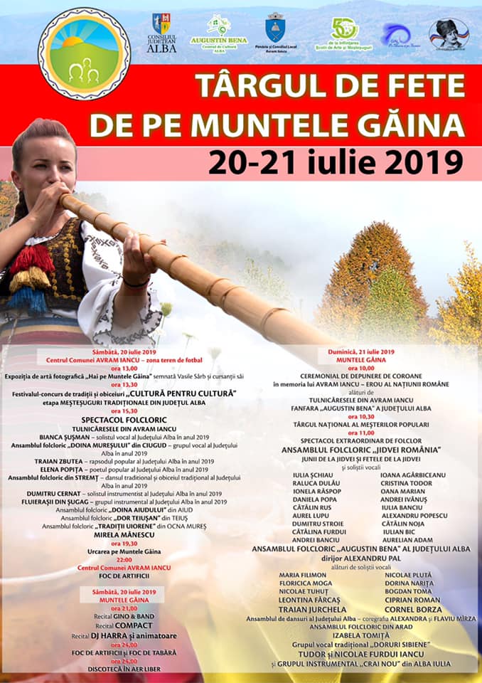 * 20 – 21 iulie 2018 – la Avram Iancu şi pe Muntele Găina *Mii de oameni sunt așteptați și în acest an să urce pe Muntele Găina, la Târgul de Fete, cea mai mare și mai cunoscută sărbătoare populară din România. Târgul are o vechime de sute de ani și este organizat anual în cea mai apropiată duminică de sărbătoarea Sfântului Ilie (20 iulie). Timp de două zile, în 20 și 21 iulie 2019, organizatorii au pregătit expoziții, spectacole folclorice cu nume mari ale muzicii populare românești, concerte de muzică ușoară, focuri de artificii și petreceri în aer liber. Târgul de Fete va debuta sâmbătă, la ora 13:00, în Avram Iancu, cea mai apropiată localitate de Muntele Găina, cu expoziția de artă fotografică „Hai pe Muntele Găina” semnată Vasile Sârb și cursanții săi de la Clasa de artă fotografică din cadrul Școlii de Arte și Meșteșuguri a Centrului de Cultură „Augustin Bena”. La ora 13:30 este programată etapa „Meșteșuguri tradiționale din Județul Alba” a Festivalului-concurs de tradiții și obiceiuri „Cultură pentru Cultură”. Va urma de la ora 15:30 un spectacol folcloric extraordinar deschis de Tulnicăresele din Avram Iancu și în care vor evolua câștigătorii etapelor din acest an ale Festivalului-concurs de tradiții și obiceiuri „Cultură pentru Cultură”: BIANCA ȘUȘMAN – solistul vocal al Județului Alba în anul 2019, Ansamblul folcloric ,,DOINA MUREȘULUI” din Ciugud – grupul vocal al Județului Alba în anul 2019, TRAIAN ZBUTEA – rapsodul popular al Județului Alba în anul 2019, ELENA POPIȚA – poetul popular al Județului Alba în anul 2019, Ansamblul folcloric din Stremț – dansul tradițional și obiceiul tradițional al Județului Alba în anul 2019, DUMITRU CERNAT – solistul instrumentist al Județului Alba în anul 2019, FLUIERAȘII DIN ȘUGAG – grupul instrumental al Județului Alba în anul 2019. Programul va fi întregit de Ansamblul folcloric „Doina Aiudului” din Aiud, Ansamblul folcloric „Dor Teiușan” din Teiuș și Ansamblul folcloric „Tradiții Uiorene” din Ocna Mureș. Sâmbătă seara, Târgul de Fete continuă pe Muntele Găina, unde de la ora 21:00 vor avea loc recitaluri cu Gino & Band, Trupa COMPACT și DJ Harra cu animatoare. La ora 24:00 va începe focul de artificii, iar petrecerea va continua pe Muntele Găina până târziu în noapte cu discotecă în aer liber și focuri de tabără. Duminică, Târgul de Fete debutează la ora 10:00 cu un ceremonial solemn la Crucea Iancului de pe Muntele Găina, unde va avea loc o slujbă Te Deum și oficialitățile prezente la eveniment vor depune coroane de flori. Momentul solemn va fi accentuat de Tulnicăresele din Avram Iancu și Fanfara „Augustin Bena” a Județului Alba.La ora 10:30 va fi deschis Târgul Național al Meșterilor Populari la care meșteri iscusiți își vor prezenta roadele muncii lor, respectiv obiecte tradiționale pe care continuă să le fabrice prin tehnici vechi de sute de ani.Programul va continua cu un spectacol extraordinar de folclor deschis de Ansamblul Folcloric „Jidvei România” – Junii de la Jidvei și Fetele de la Jidvei și soliștii vocali: Iulia Șchiau, Ioana Agârbiceanu, Raluca Dulău, Cristina Todor, Ionela Răspop, Oana Marian, Daniela Popa, Andrei Ivănuș, Cătălin Rus, Iulia Banciu, Aurel Lupu, Alexandru Popescu, Dumitru Stroie, Cătălin Noja. Spectacolul va continua cu Ansamblul Folcloric „Augustin Bena” al Judeţului Alba, dirijor Alexandru Pal, coregrafi Alexandra și Flaviu Mîrza, împreună cu soliştii vocali: Maria Filimon, Nicolae Plută, Floricica Moga, Dorina Narița, Nicolae Tuhuț, Bogdan Toma, Leontina Fărcaș, Ciprian Roman, Traian Jurchela și Cornel Borza. În program va evolua și Ansamblul Folcloric din Arad, Izabela Tomiță și Grupul vocal tradițional „Doruri Sibiene”. În finalul spectacolului, este pregătit un recital special susținut de Tudor și Nicolae Furdui Iancu alături de Grupul Instrumental „Crai Nou” din Alba Iulia. „Târgul de Fete de pe Muntele Găina este un brand al Județului Alba, dar și al României, fiind dovada vie a păstrării tradițiilor și obiceiurilor românești. Pe Muntele Găina se rescrie, an de an, povestea frumoasă a Târgului de Fete, cea mai mare și cea mai cunoscută sărbătoare populară românească. Dacă în urmă cu sute de ani sărbătoarea era un prilej pentru oamenii din zonă să se întâlnească venind din localitățile apropiate Muntelui Găina, să își revadă rudele sau prietenii, iar pentru tineri să se cunoască, să lege prietenii și chiar să se căsătorească, acum Târgul de Fete reprezintă modul în care ne arătăm respectul, conservăm și valorificăm obiceiurile tradiționale românești. Târgul de Fete este așadar o invitație de a respecta și promova portul tradițional, meșteșugurile, tradițiile și obiceiurile noastre unice. Vă așteptăm cu drag pe Muntele Găina: Hai pe Muntele Găina! Hai pe muntele dragostei! Dragoste pentru tot ceea ce este frumos și pur românesc”, a spus Alexandru Pal, managerul Centrului de Cultură „Augustin Bena”.Târgul de Fete de pe Muntele Găina este organizat de Consiliul Județean Alba prin Centrul de Cultură „Augustin Bena”, Primăria și Consiliul Local Avram Iancu. Târgul de Fete de pe Muntele Găina – cea mai mare sărbătoare românească în aer liberTârgul de Fete de pe Muntele Găina este pe drept cuvânt un brand al României, manifestarea fiind cunoscută ca și cea mai mare sărbătoare populară în aer liber. Târgul se desfășoară atât în Avram Iancu, la poalele Muntelui Găina, cât și pe un platou montan la o altitudine de aproape 1.500 de metri, într-o zonă pitorească și perfectă pentru iubitorii de natură. Târgul de Fete de pe Muntele Găina se organizează, în fiecare an, din vremuri străvechi, în cea mai apropiată duminică de 20 iulie