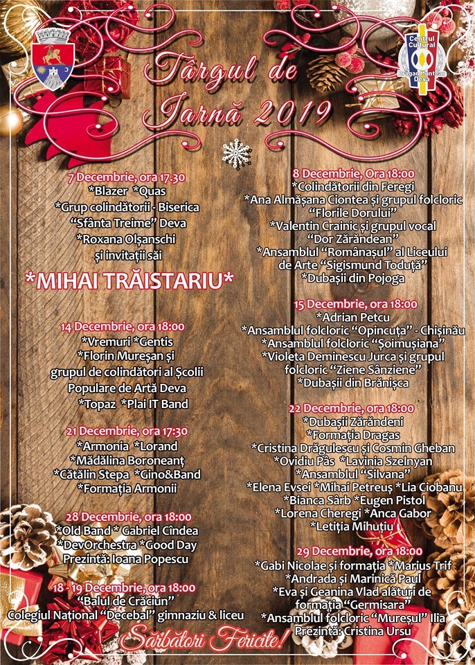 Târgul de Iarnă de la Deva se deschide de Ziua Naţională a României, în Piaţa Unirii şi pe Bulevardul 1 Decembrie 1918 din centrul oraşului şi va funcţiona până în 31 decembrie 2019.