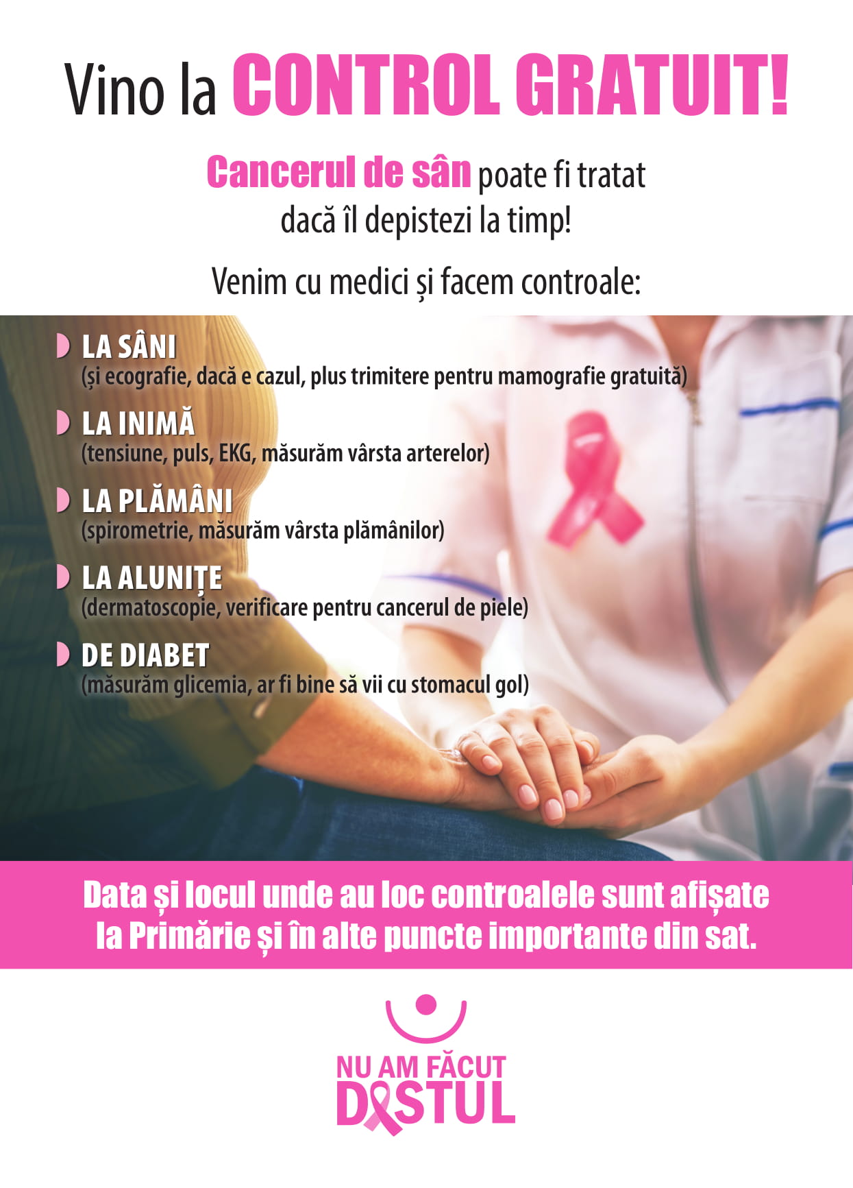 Federația Asociațiilor Bolnavilor de Cancer (FABC), în parteneriat cu Asociația Pacienților Cronici din România, organizează a V-a ediție a campaniei „Nu am făcut destul”, care are ca scop testarea gratuită pentru depistarea cancerului la sân în rândul femeilor din mediul rural.