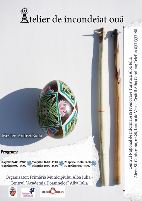 Din acest week-end, Centrul Național de Informare și Promovare Turistică din Cetatea Alba Carolina va deveni spațiu liber pentru creație și inspirație. Micii albaiulieni sunt în special vizați de atelierul inedit de încondeiat ouă, pregătit de municipalitate, însă bineveniți sunt și cei mari, care vor să își exprime în cel mai creativ mod ideile de înfrumusețare a tradiționalelor ouă de Paște.În după amiezile de vineri, durata atelierelor este de 3 ore iar sâmbătă, începând cu ora 10, atelierele de încondeiat ouă se vor derula pe parcursul a 5 ore. Pentru a le da ocazia cat mai multor iubitori de frumos să se bucure de aceasta experiență, toate activitățile se vor desfășura în serii de câte 12 persoane, până pe data de 30 aprilie, pentru că ouăle se pot încondeia până la Sărbătoarea Înălțării Domnului.„Pe cât de migăloasă munca, pe atât de frumos rezultatul. Mă bucur ca le putem oferi albaiulienilor dar și turiștilor mici și mari, acum, în preajm sărbătorilor pascale, o experiență interactivă și inedită, cum nu îmi mai amintesc să mai fi fost în oraș până acum. Îi încurajez pe cât mai mulți să vină și să trăiască pe viu acest mod atât de românesc de pregătire a Paștelui.” spune Gabriel Pleșa, primarul municipiului Alba Iulia.Participarea la atelierele de încondeiat ouă este gratuită iar “operele” rezultate pot fi luate acasă de către creatorii lor.Atelierele se vor desfășura în datele de 8-9 aprilie, 15-16 aprilie, 29-30 aprilie, în serii de câte maxim 12 persoane, la fiecare 45 de minute. Înscrierile în serii se pot face la Centrul Național de Informare și Promovare Turistică, din Cetatea Alba Carolina, Aleea Sf. Capistrano, nr. 28, între orele 09.00-17.00, la telefon 0371 337 148 sau pe e-mail turism@apulum.ro.