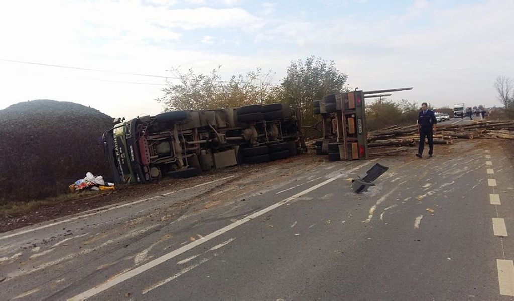 „În timp ce conducea ansamblul de vehicule încărcat cu lemne de foc, se pare că nu a adaptat viteza la condițiile de drum într-o succesiune de curbe, încărcătura a intrat în balans și s-a răsturnat pe carosabilul DN 13 A, blocând un sens de mers”, a explicat Gheorghe Filip.
