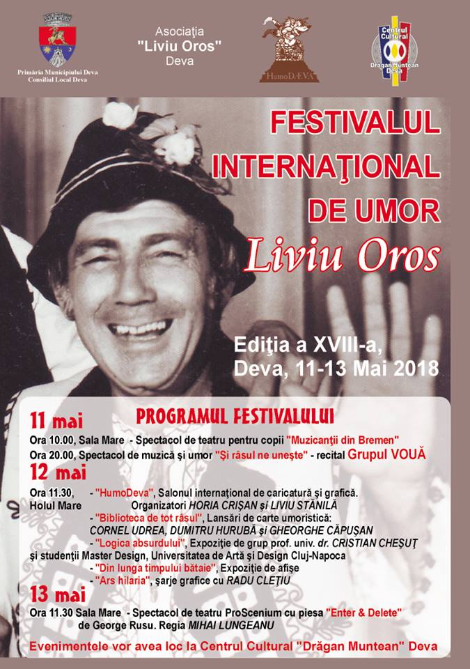 Salon internațional de caricatură, spectacol de teatru pentru copii, lansări de carte umoristică, expoziții, șarje grafice, spectacol de muzică și umor sunt doar câteva dintre manifestările care vor avea loc în cadrul Festivalului Internațional de Umor ”Liviu Oros” (ediția a XVIII-a), care debutează vineri, 11 mai 2018, la ora 10:00, la Centrul Cultural ”Drăgan Muntean” din Deva.
