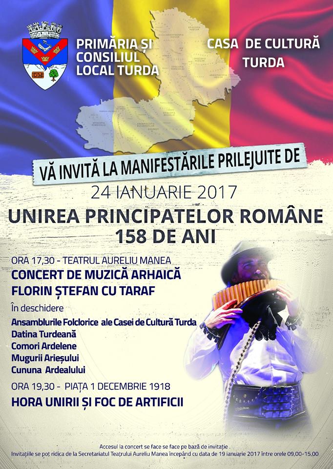 Primăria Municipiului Turda aorganizează manifestări prilejuite de aniversarea a 158 de ani de la Unirea Principatelor Române, care se vor desfășura marți, 24 ianuarie 2017.