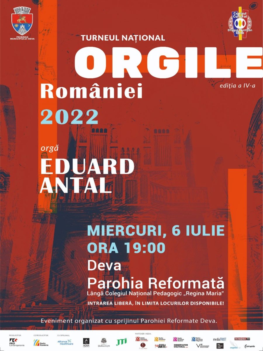 Primăria Municipiului Deva și Centrul Cultural ,,Drăgan Muntean” Deva organizează cea de-a patra ediţie a Turneului Național ,,Orgile României”, miercuri, 6 iulie 2022, ora 19:00, la Parohia Reformată din Deva (lângă Colegiul Național Pedagogic ,,Regina Maria”).