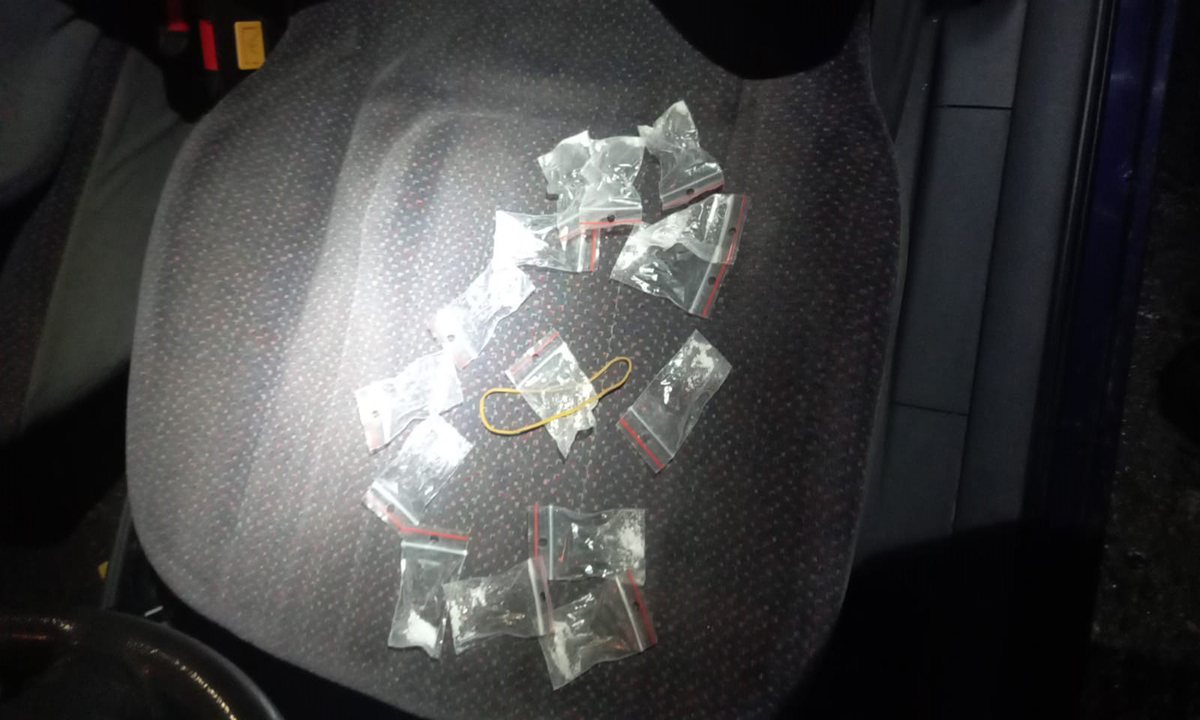 În urma verificărilor efectuate asupra autoturismului, în portiera stânga față au fost descoperite 15 pliculețe în care se afla un praf de culoare albă, posibil metamfetamină.