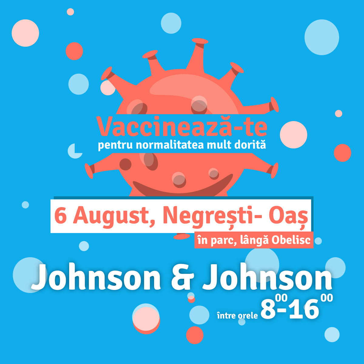 Vineri 06.08.2021, între orele 08,00 -16,00 oricine se poate imuniza cu vaccin în doză unică de la Johnson&Johnson la punctul de vaccinare organizat în Negrești-Oaș, în parc, lângă Obelisc. E simplu, doar cu buletinul, se eliberează pe loc adeverința de vaccinare. Ulterior, certificatul digital UE privind COVID-19 poate fi obținut de pe portalul https://certificat-covid.gov.ro.