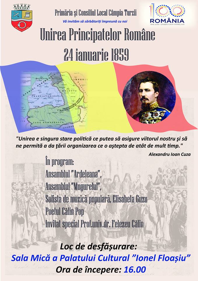 Primăria Municipiului Câmpia Turzii organizează, miercuri 24 ianuarie 2018, de la ora 16.00, la Palatul Cultural „Ionel Floașiu” – sala mică, sărbătorirea a 159 de ani de la Unirea Principatelor Române.