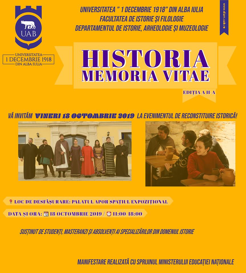 Vineri, 18.10.2019, Universitatea ,,1 Decembrie” din Alba Iulia organizeaza cea de-a doua editie a evenimentului de reconstituire istorica ,,Historia Memoria Vitae”. Studenti, masteranzi si absolventi ai specializarilor din domeniul istoriei vor da viata personajelor istorice in spatiul expozitional din Palatul Apor unde vor fi organizate si ateliere de reconstituire istorica, intre orele 11,00 si 18,00.