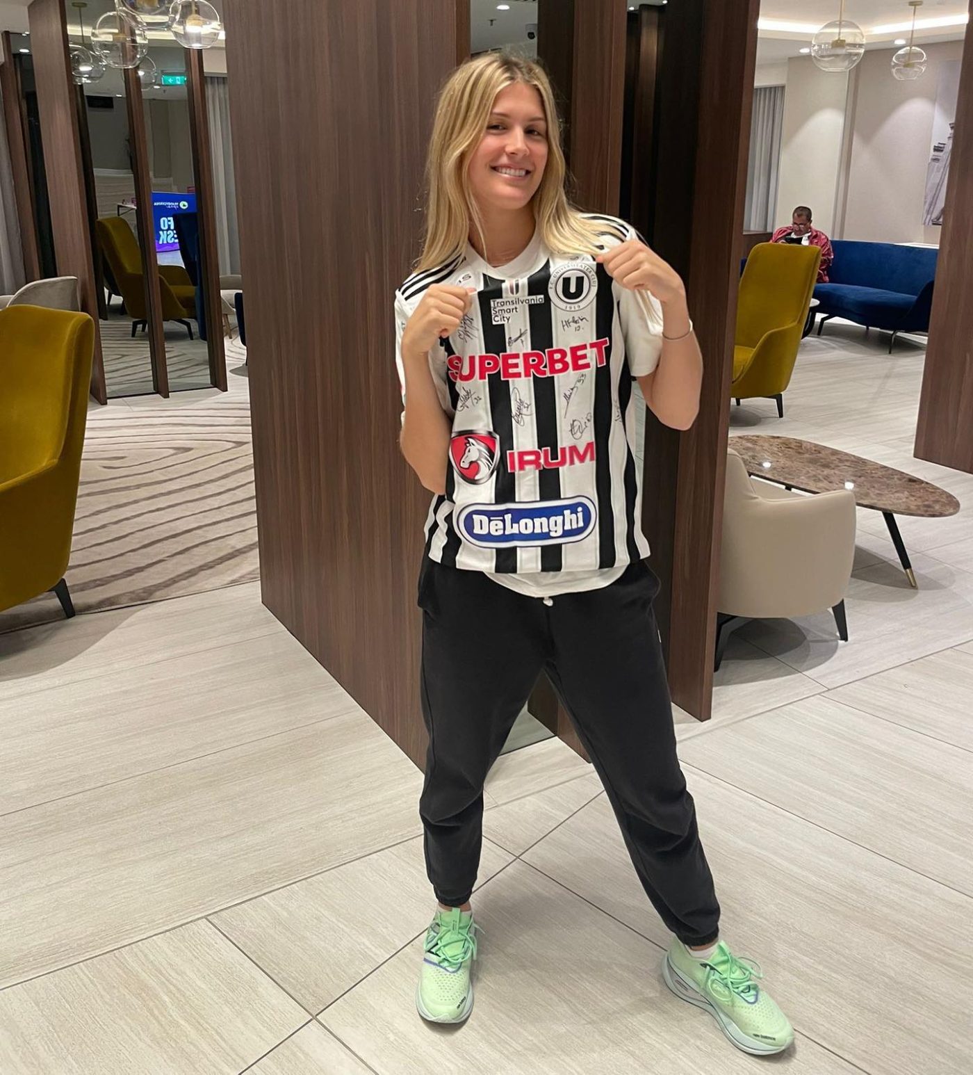 Poză spectaculoasă publicată de echipa de fotbal Universitatea Cluj, pe pagina oficială de Facebook. În fotografia postată apare frumoasa tenismenă Eugenie Bouchard, îmbrăcată în tricoul lui „U”. Canadianca a participat în această săptămână la turneul Transylvania Open, fiind eliminată din primul tur.