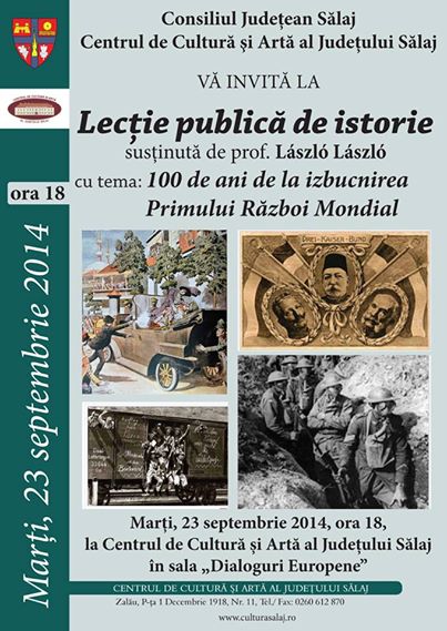 Centrul de Cultură și Artă al Județului Sălaj, instituție a Consiliului Județean Sălaj, îi invită pe zălăuani la Lecția publică de istorie susținută de prof. László László cu tema 100 de ani de la izbucnirea Primului Război Mondial. Marți, 23 septembrie 2014, de la ora 18, în Sala „Dialoguri europene” de la Centrul de Cultură și Artă al Județului Sălaj.