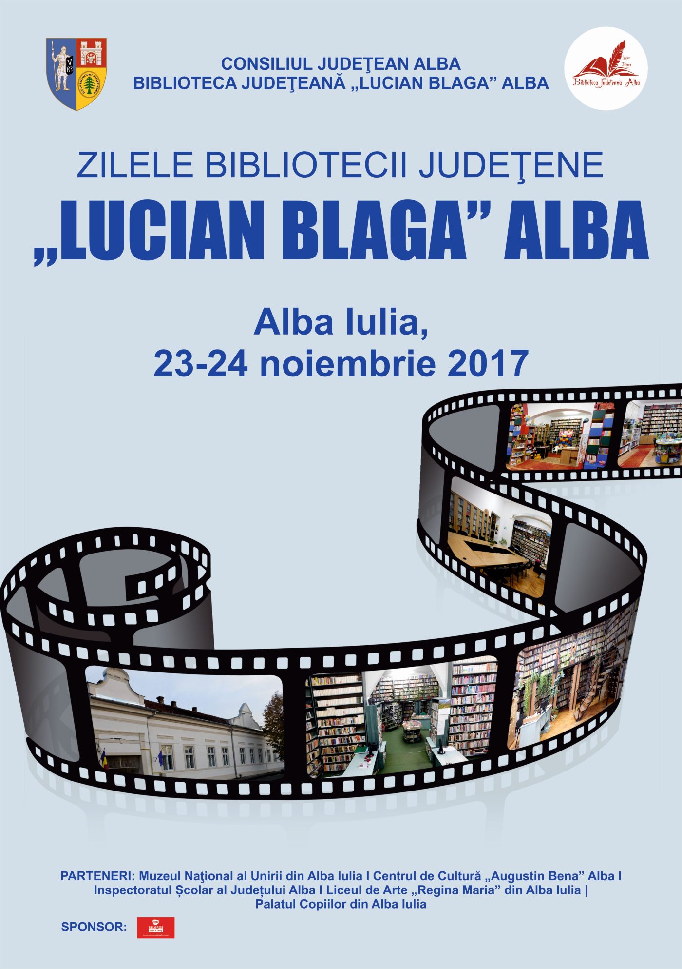 ZILELE BIBLIOTECII JUDEŢENE „LUCIAN BLAGA” ALBAAlba Iulia, 23 – 24 noiembrie 2017PROGRAM Alba Iulia, 23–24 noiembrie 2017, orele 8:00–19:00Biblioteca Judeţeană „Lucian Blaga” Alba (sediu şi filiale)Expoziţii tematice de carte: ALBA – O poveste care continuă; Întâlnește-ți personajul preferat; Cultură, educaţie şi voluntariatExpoziţie de sculptură „Requiem”, semnată de Stefan Balog, Fundaţia Inter-Art Aiud Alba Iulia, județul Alba, 23 noiembrie 2017, orele 9:00–19:00 Biblioteca Judeţeană „Lucian Blaga” Alba și bibliotecile publice partenere din județul ALBA ALBA – O poveste care continuă.Provocare la lectură. Cititorii care vizitează biblioteca vor fi invitați să lectureze fragmente din cărțile aflate în expozițiile tematice;Alba Iulia, orașul istorie. Difuzarea înregistrării audio realizată de Felicia Colda;Către cititori. Oferirea de scrisori cu citate despre municipiul Alba Iulia şi judeţul Alba. Alba Iulia, 23 noiembrie 2017, orele 9:00–14:00Biblioteca Judeţeană „Lucian Blaga” Alba (sediu şi filiale)Întâlnește-ți personajul preferat ! Activități interactive pentru copii: lecturi, ateliere creative, vizionări de filme, scenete, surprize.Alba Iulia, 23 noiembrie 2017, orele 10:00–12:00Biblioteca Judeţeană „Lucian Blaga” AlbaAlba ReCREATIVĂ. Proiecte educaționale derulate în colaborare cu Liceul de Arte „Regina Maria” din Alba IuliaVernisajul expoziției Alba Iulia – o nouă perspectivă vizuală/Alba Iulia – a new visual perspective, Ediţia I;Vernisajul expoziției Cuvânt și culoare.Alba Iulia, 23 noiembrie 2017, orele 11:00–12:30Biblioteca Judeţeană „Lucian Blaga” Alba, Sala de lecturăCultură, educaţie şi voluntariat: masă rotundă. Participă invitaţi din instituţiile de cultură şi de învăţământ partenere, voluntarii bibliotecii. Moderator: Felicia ColdaAlba Iulia, 23 noiembrie 2017, orele 17:00–18:00Biblioteca Judeţeană „Lucian Blaga” AlbaPrezentări de carte: Dan Orga-Dumitriu, Fă Rai din ce ai!Mihai-Octavian Groza, Ilie Stricatu. Pe cărările destinului. Romanul vieţii trăite (1914–1918) Moderator: Daniela FloroianAlba Iulia, 23 noiembrie 2017, orele 18:30–20:00Sala Unirii – Muzeul Naţional al Unirii din Alba Iulia, Cafenea culturalăOmul şi taina lui: recital extraordinar – Dorel VişanMoment muzical susţinut de Cvartetul Augustin Bena Moderator: Daniela FloroianAlba Iulia, 24 noiembrie 2017, orele 9:00–14:00Biblioteca Judeţeană „Lucian Blaga” Alba (sediu şi filiale)Întâlnește-ți personajul preferat ! Activități interactive pentru copii: lecturi, ateliere creative, vizionări de filme, scenete, surprize.Alba Iulia, 24 noiembrie 2017, orele 11:00-12:00Filiala Centrul de Zi pentru Persoane VârstniceClubul de lectură al seniorilor: lecturi, dezbateri, dialog. Moderator: Daniela FloroianAlba Iulia, 24 noiembrie 2017, orele 17:00-18:00Biblioteca Judeţeană „Lucian Blaga” AlbaParteneri ai bibliotecii. Vernisajul expoziţiei „Requiem”, semnată de Stefan Balog, Fundaţia Inter-Art Aiud. Prezintă: Elena CristeaPrezentări de carte:Ioan Adrian Popa, IntimeleAlin Tomuş, Locuri goale Moderator: Daniela FloroianAlba Iulia, 24 noiembrie 2017, orele 18:00-19:00Biblioteca Judeţeană „Lucian Blaga” AlbaCarnavalul personajelor preferate. Participă copii, părinţi şi bunici din municipiul Alba Iulia;Şcoala de Folk. Momente muzicale susţinute de elevii de la Palatul Copiilor din Alba Iulia, coord. Daniel Avram; Face painting cu Meda.