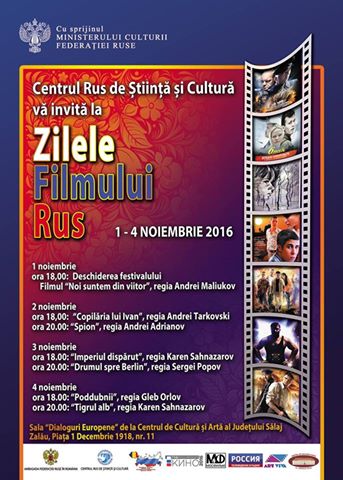 Centrul Rus de Știință și Cultură, cu sprijinul Ministerului Culturii Federației Ruse, vă invită la Zilele Filmului Rus, în cadrul Festivalului Artelor Muza Fest, în perioda 1-4 noiembrie 2016, în Sala „Dialoguri europene” de la Centrul de Cultură și Artă al Județului Sălaj.