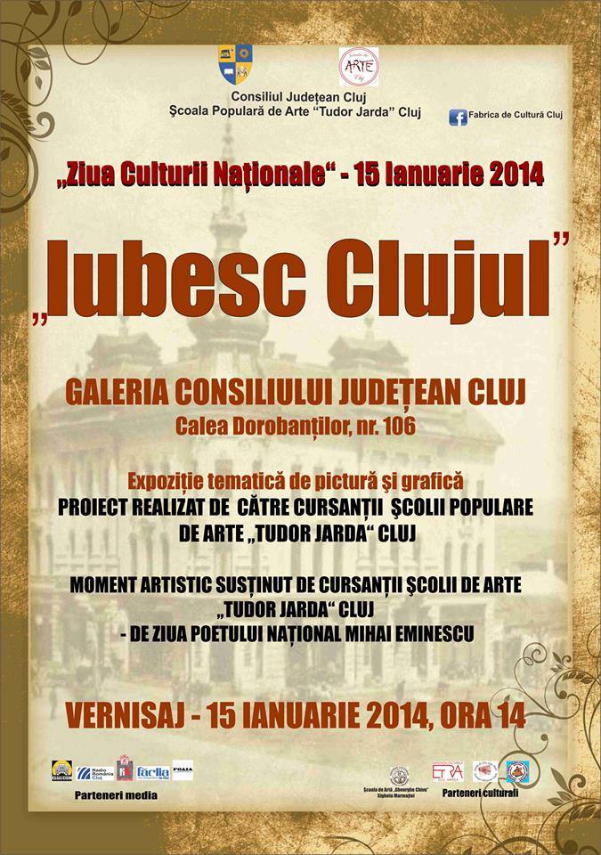 În data de 15 ianuarie 2014, cu începere de la ora 14, holul clădirii Consiliului Judeţean Cluj va găzdui un moment cultural inedit: vernisarea expoziţiei de pictură şi grafică „Iubesc Clujul” cu lucrări aparţinând cursanţilor Şcolii Populare de Artă „Tudor Jarda” Cluj-Napoca, instituţie de cultură aflată în subordinea forului administrativ judeţean.