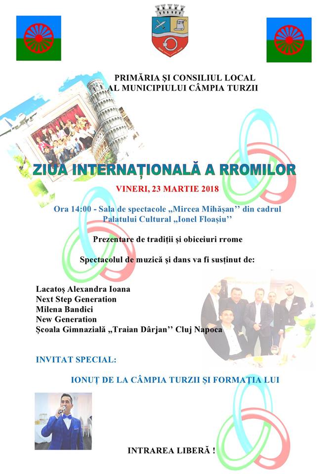 Primăria și Consiliul Local al Municipiului Câmpia Turzii, în parteneriat cu Asociația Civică pentru Inițiativă și Acțiune Comunitară, organizează vineri, 23 martie 2018, de la ora 14.00 manifestări dedicate Zilei Internaționale a Rromilor.