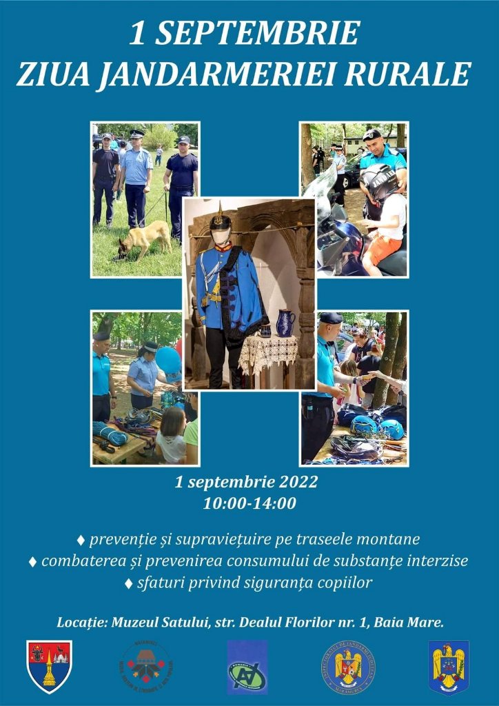 Pe data de 1 septembrie 2022 marcăm 129 de ani la înființarea Jandarmeriei Rurale. În acest context, Consiliul Județean Maramureș, prin Muzeul Județean de Etnografie și Artă Populară Maramureș, în parteneriat cu Inspectoratul de Jandarmi Județean Maramureș, Biroul Siguranță Școlară din cadrul IPJ MM și Agenția Națională Antidrog, vă invită la o serie de activități dedicate acestei zile, care vor avea loc mâine, 1 septembrie, în Satul de pe Deal din Baia Mare.În cadrul evenimentului, jandarmii montani vor prezenta copiilor tehnicile folosite în domeniul montan, îi vor sfătui în ceea ce privește drumețiile lor prin pădure și pe traseele montane și le vor explica cum să procedeze atunci când întâlnesc un animal sălbatic. De asemenea, cei prezenți vor avea ocazia sa afle despre echiparea corespunzătoare în zona montană, despre importanța respectării traseelor, atenția privind prevenirea accidentărilor și posibilitatea apelării serviciului unic de urgență 112 în caz de necesitate. Jandarmii vor executa câteva exerciții și alături de câinii de serviciu, partenerii lor în misiuni.De asemenea, reprezentații poliției și antidrog vor discuta despre combaterea și prevenirea consumului de substanțe interzise, dar și despre siguranța copiilor și adolescenților la școală și în vacanță.
