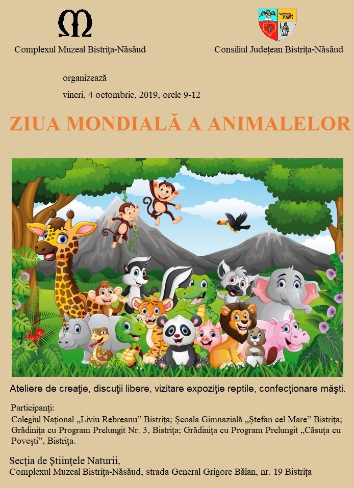 Vineri, 4 octombrie 2019, de la orele 9-12, Complexul Muzeal Bistriţa-Năsăud, prin secţia de Ştiinţele Naturii, desfăşoară activităţi de pedagogie muzeală, cu tema “Prietenele noastre animalele”, dedicate Zilei Mondiale a Animalelor.