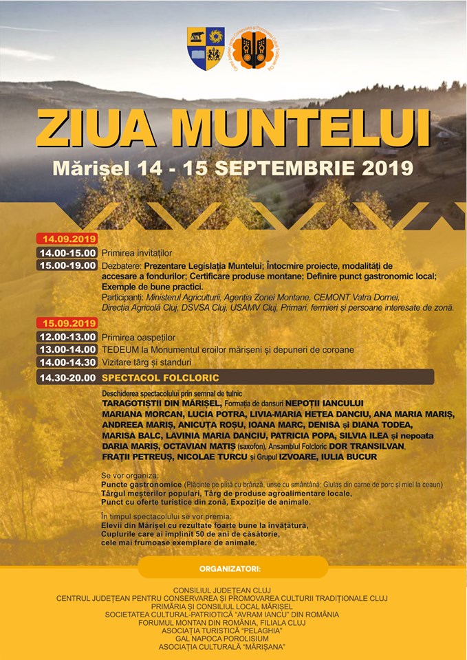 În localitatea clujeană Mărișel va avea loc la finalul acestei săptămâni un Știri deja cu tradiție, intitulat „Ziua Muntelui”. Manifestarea, organizată de Centrul Județean pentru Conservarea si Promovarea Culturii Tradiționale Cluj, instituție de cultură aflată în subordinea Consiliului Județean Cluj, împreună cu Primăria și Consiliul Local Mărișel, Societatea cultural-patriotică „Avram Iancu”, Forumul Montan din România, Asociația turistică „Pelaghia Roșu”, Gal Napoca Porolissum și Asociația culturală „Mărișana”, are rolul de a promova spaţiul mioritic al Apusenilor, în ceea ce privește meșterii populari, cultura tradițională, turismul, agricultura și produsele culinare.