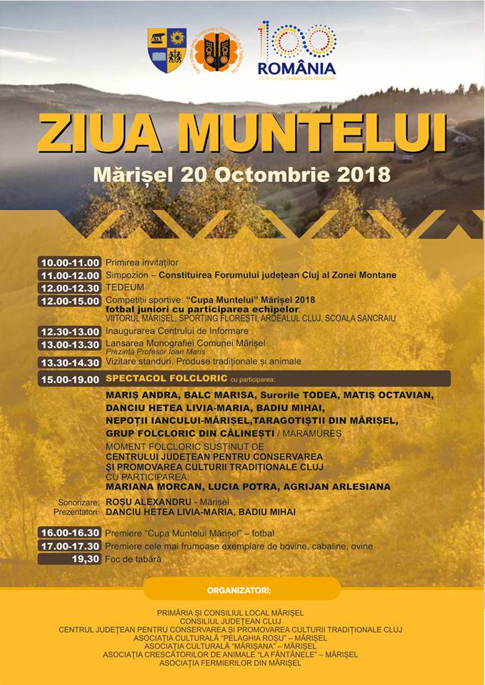 Centrul Județean pentru Conservarea și Promovarea Culturii Tradiționale Cluj, alături de Primăria și Consiliul Local Mărișel, împreună cu Asociațiile culturale „Pelaghia Roșu” și „Mărișana”, Asociația crescătorilor de animale „La Fântânele” și Asociația fermierilor din Mărișel, invită iubitorii de folclor și tradiție să ia parte sâmbătă, 20 octombrie 2018, în localitatea clujeană Mărișel la ,,Ziua Muntelui”.
